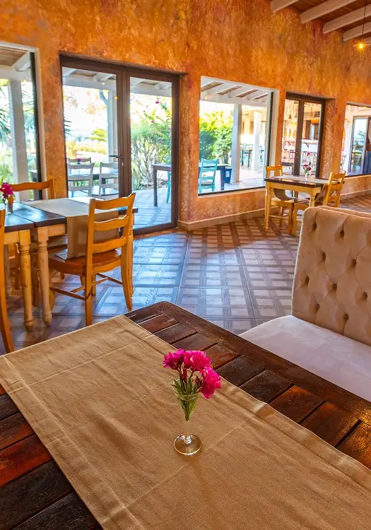 The Upper Patio next to the restaurant combines a full ocean view with natural breeze and light vegetation,perfect for sunset cocktails or relaxing between meals. Each terrace is spaced out from the others, preserving privacy and reinforcing the feeling of exclusivity and contact with nature.